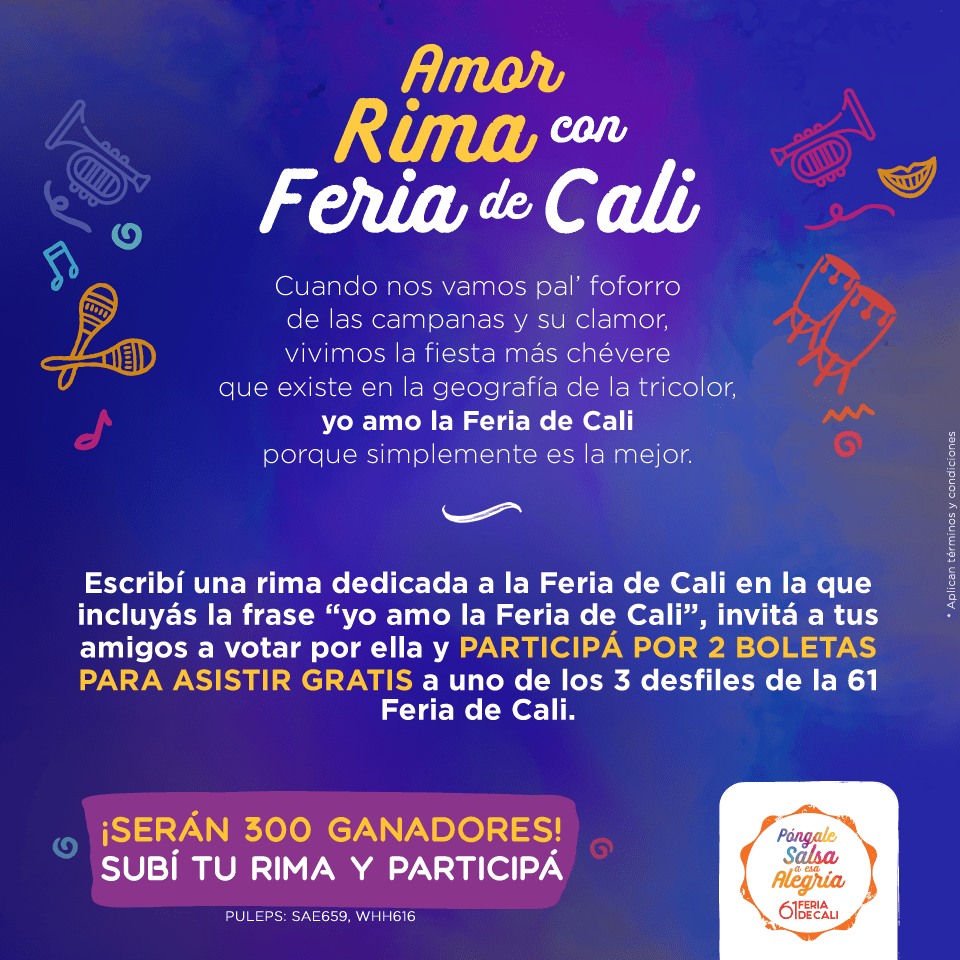 Pero las buenas noticias continúan, las personas que no ganaron tendrán más actividades digitales para participar por entradas dobles. El nuevo concurso es muy sencillo, solo hay que componer una rima que incluya la frase “Yo Amo la Feria de Cali”. Los 300 participantes con más votos ganarán dos boletas para uno de los tres desfiles. Para participar ingresa aquí.