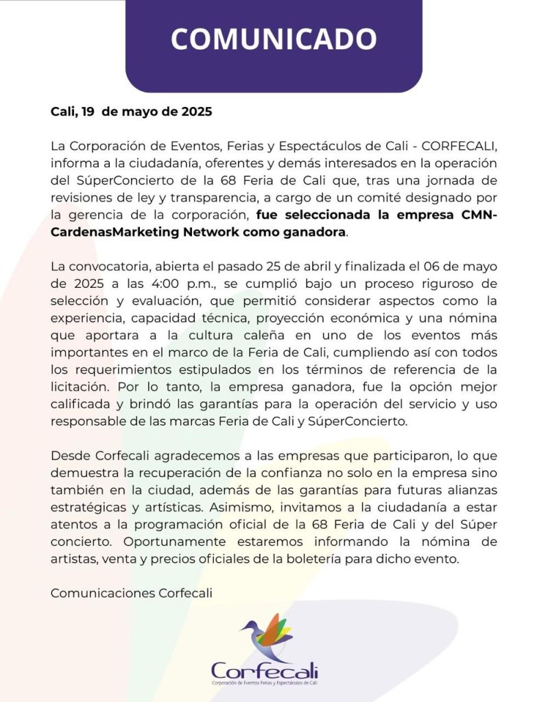 Seleccionada la empresa para la operación del Superconcierto de la 68 Feria de Cali