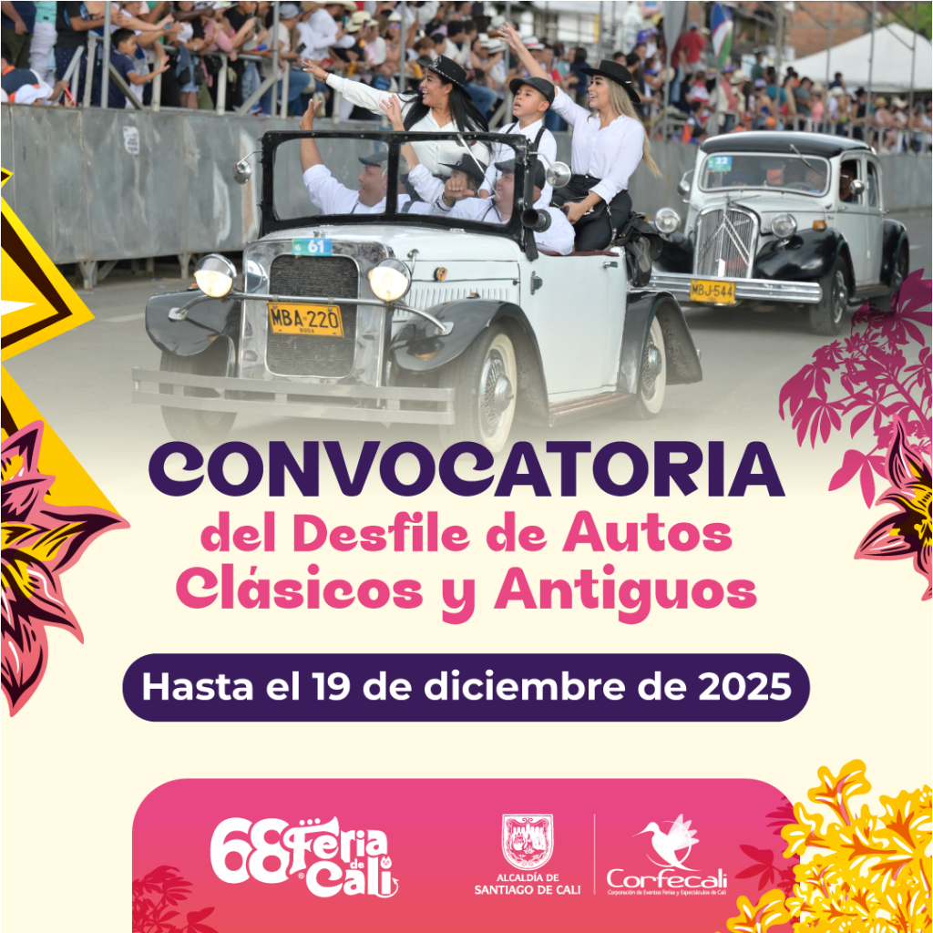 Abierta convocatoria para participar en el desfile de Autos Clásicos y Antiguos ‘La Huella de un Motor’ La Corporación de Eventos, Ferias y Espectáculos (Corfecali) y la Asociación Amigos Autos Antiguos y Clásicos (Club AAAA) informan a los amantes y poseedores de automóviles de colección que ya se encuentra abierta la convocatoria para participar en el desfile de Autos Clásicos y Antiguos ‘La Huella de un Motor’, que tendrá lugar el día 27 de diciembre de 2025, en el marco de la programación de la 68 Feria de Cali. Por ello, Corfecali, en cumplimiento de su misión de planear, producir, ejecutar y promocionar los eventos de la Feria de Cali, invita a los interesados en participar en este glamuroso desfile a inscribirse en la presente convocatoria. Las fechas de inscripción son hasta el 19 de diciembre de 2025 por un valor de $250.000 y del 20 al 24 de diciembre habrá inscripciones extemporáneas que tendrán un costo de $500.000. Formulario de inscripción.