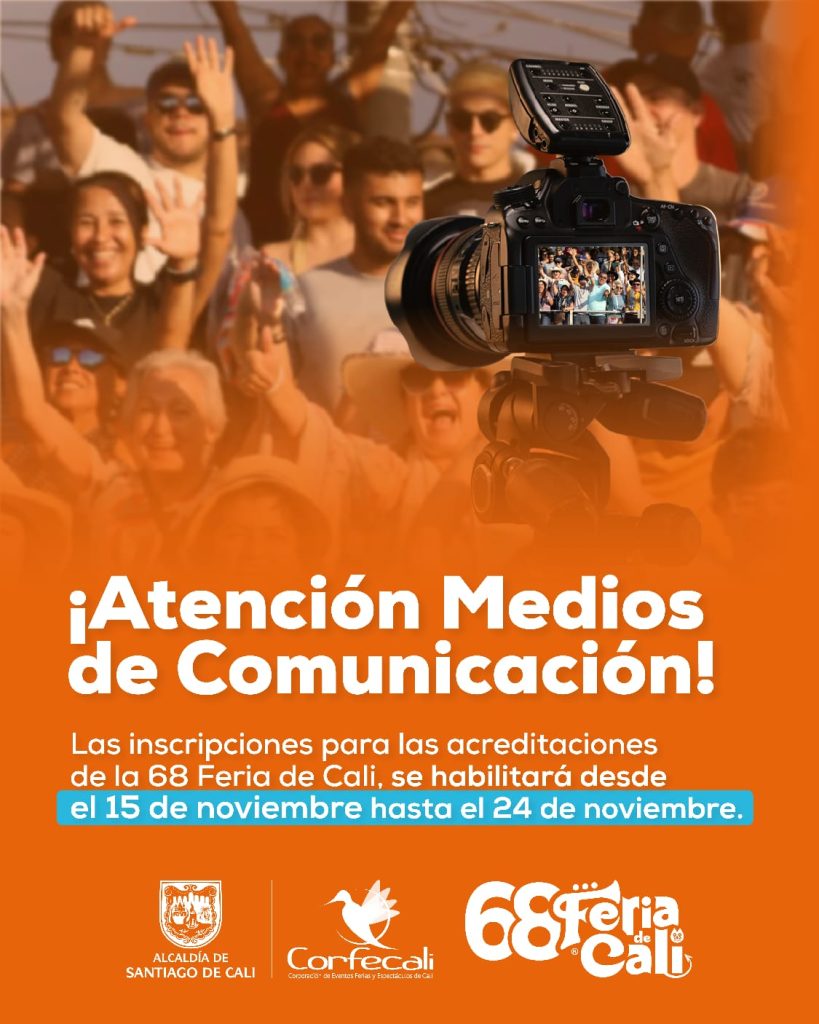 Corfecali informa a los medios de comunicación y a sus directores que ya está abierto el proceso de acreditación para el cubrimiento periodístico de la 68ª Feria de Cali, que se llevará a cabo del 25 al 30 de diciembre de 2025. Del 15 al 24 de noviembre de 2025 estará abierto el proceso de acreditación para los medios interesados en cubrir oficialmente la gran fiesta caleña. Una vez cerrada la convocatoria, no se recibirán nuevas solicitudes. El registro podrá realizarse a través del siguiente formulario:https://sistema-corfecali.com/Admin/formulario_inscripcion.php?tipo_colectivo_id=20 En el formulario encontrará diferentes casillas que deben diligenciarse en su totalidad. A continuación, algunas recomendaciones: Además, encontrará una casilla adicional que le permitirá indicar a cuáles eventos planea asistir durante la Feria. Para realizar una correcta inscripción, se deberá adjuntar una fotografía que cumpla con las siguientes indicaciones: No se aceptarán fotografías con sombreros, gafas de sol o elementos que cubran el rostro, salvo por justificaciones médicas o religiosas, que serán evaluadas según el caso. A continuación, una imagen de referencia para la fotografía. Entrega y confirmación de credenciales Una vez aprobada la solicitud, la confirmación de la acreditación será enviada al correo electrónico registrado, junto con la información sobre la fecha, hora y lugar de entrega de las credenciales. La inscripción no garantiza aprobación automática. Corfecali se reserva el derecho de admisión de los medios, así como la cantidad de periodistas, fotógrafos, camarógrafos o técnicos acreditados. Para garantizar un uso adecuado de la acreditación, tenga en cuenta las siguientes instrucciones: La acreditación permite el acceso únicamente a los eventos producidos y operados por Corfecali en el marco de la Feria de Cali 2025. No aplica para eventos de carácter privado. Para resolver cualquier duda o solicitud adicional, puede comunicarse con el equipo de comunicaciones de Corfecali al correo: comunicaciones@corfecali.com.co